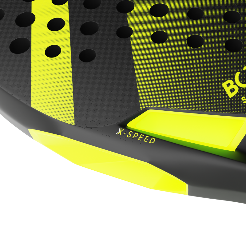 The innovative X-SPEED system removes plastic components from the racquet’s ventilation channels, reducing air resistance and enabling faster racquet‑head acceleration. This aerodynamic design improves manoeuvrability, increases swing speed and enhances directional precision, even during high‑intensity play.