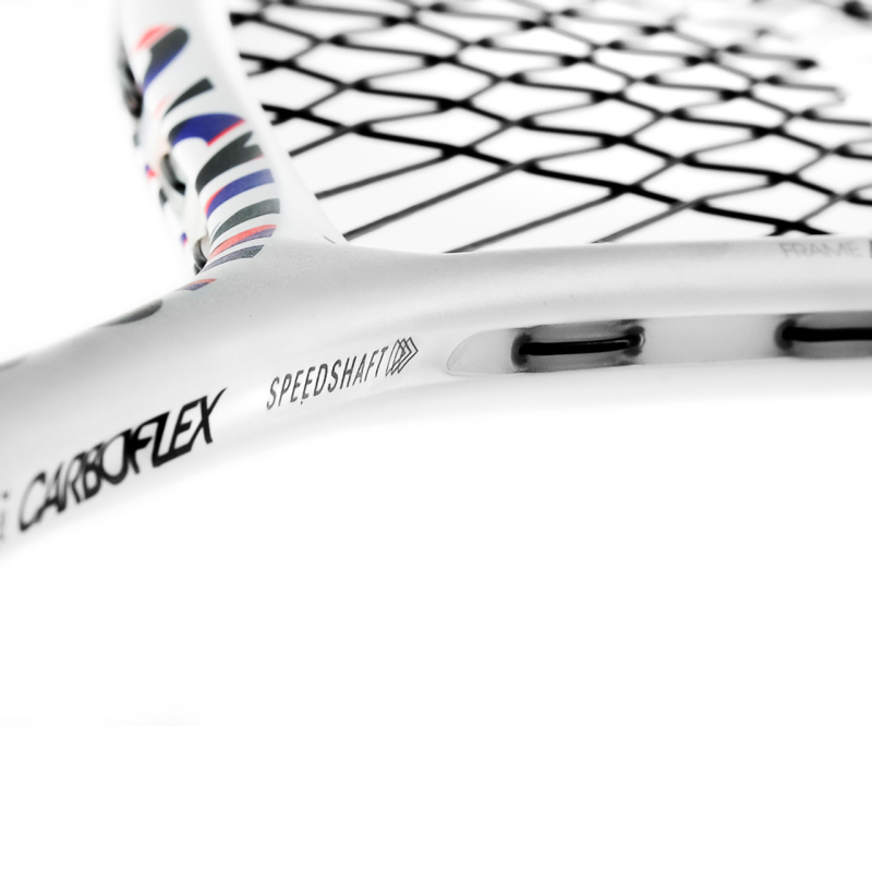 The racquet also incorporates an aerodynamic Airshaft design and a reinforced monoshaft structure with X-Arms for enhanced stability and precision. Extended String Hole technology features 12 enlarged eyelets at strategic positions to allow strings greater elasticity, improving spin and forgiveness on off-center shots.