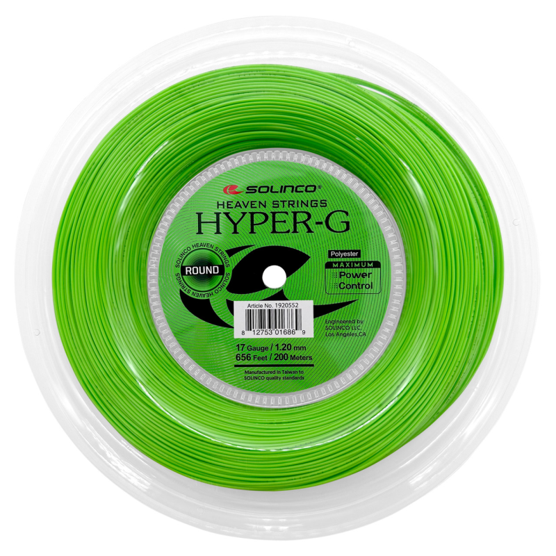 The Solinco Hyper-G Round 1.20mm Tennis String Reel is a high-performance co-polyester monofilament string designed for players seeking a combination of power, control, and durability. This 200-meter reel in green offers ample string for multiple racquet stringings.