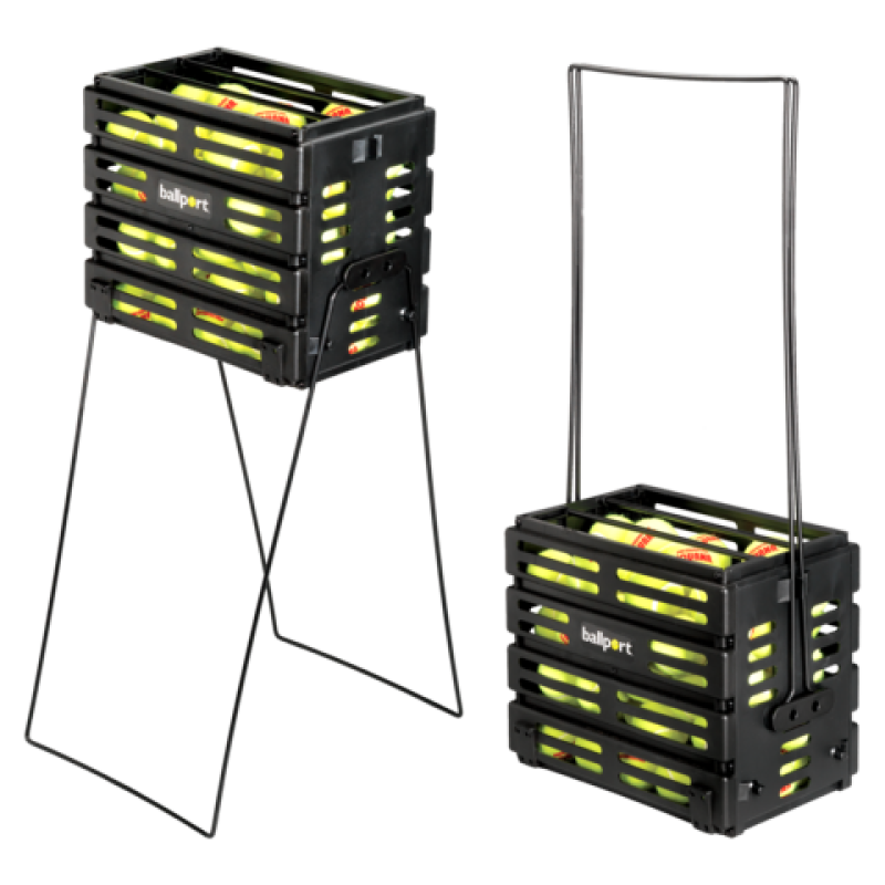Ballport® 80-Ball Basket is made of tough polypropylene. No wires to rust, welding to break or paint to peel. Handles rotate and lock up or down for easy pickup and dispensing. Ships in a small, 2 wide by 25 high box. Assembly is easy with panels locking into place and legs easily attached with provided screws. Rolling bars on the bottom help ease balls into the basket and hold hold them in. Sliding bars on the top slide open to make dispensing easy, and lock closed to hold balls during transport and storage. Handles lock into an upright position for ball collection, and in a downward position for ball dispensing with a patented locking feature. USA Patents #5,294,161, #347,670.