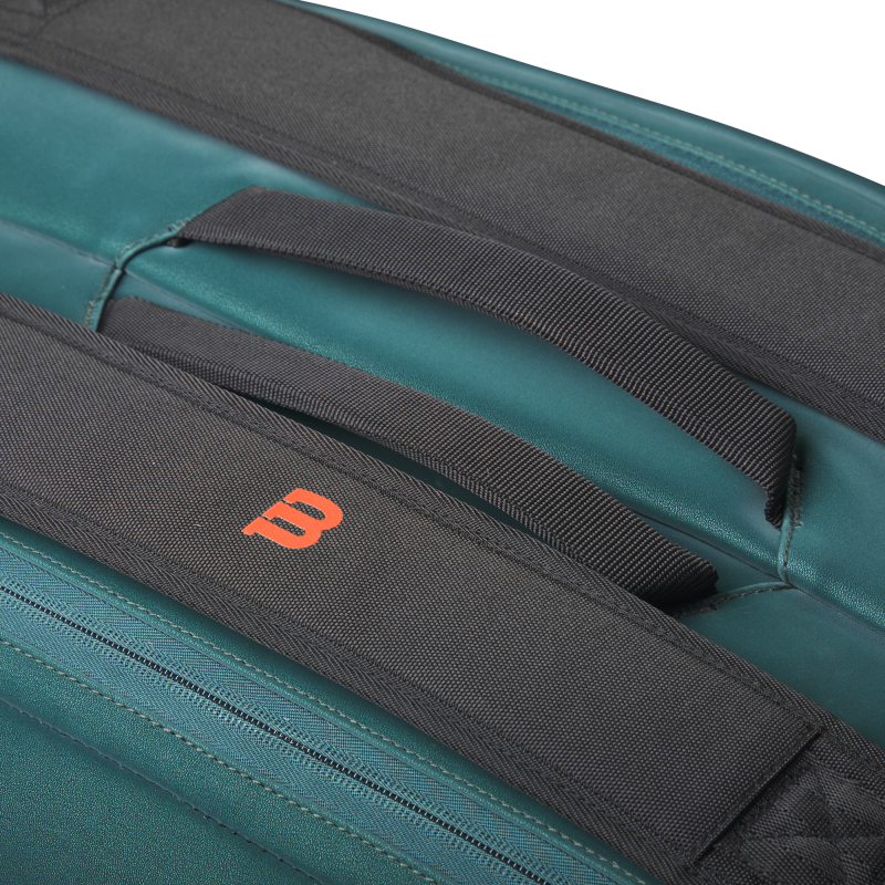 Travel to tennis matches and tournaments in sleek, multifunctional style with Wilson's Blade Super Tour 9 Pack. Inspired by the Blade V9's dynamic racket design and Emerald Green colors, this spacious bag holds up to nine rackets plus equipment, apparel and other essentials. Its two primary compartments are lined with thermoguard material to protect the rackets against temperature changes. The ventilated shoe pocket and exterior side pockets provide additional storage, while the adjustable padded straps let you wear it like a backpack.
